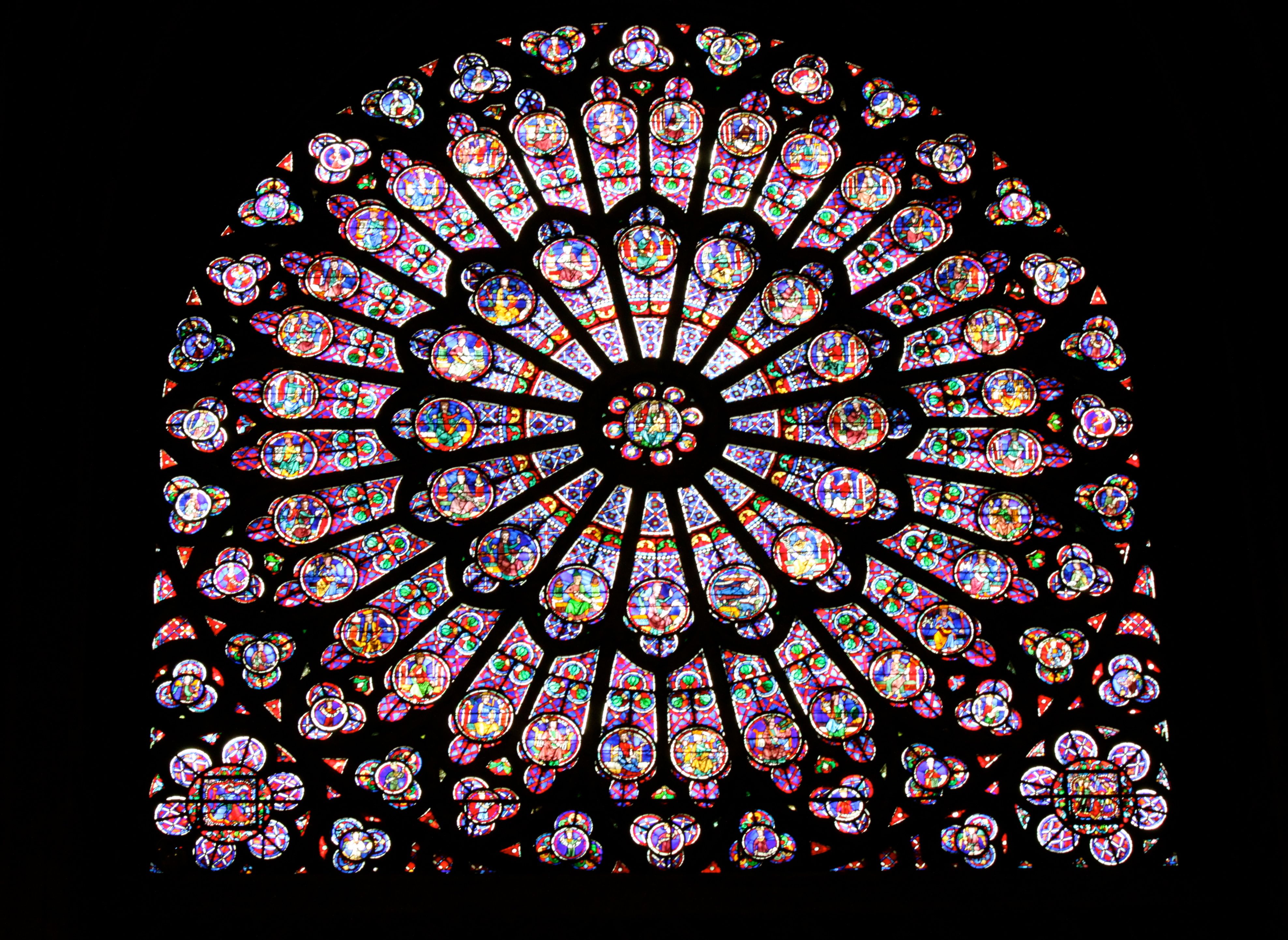 One of the many beautiful examples of the stained glass windows within the Cathedrale Notre Dame, Paris.